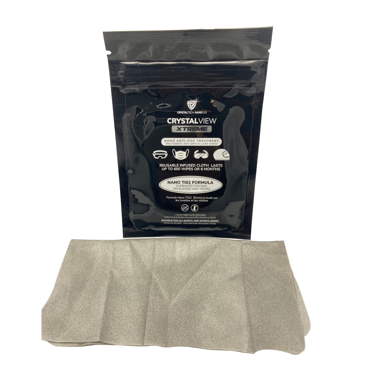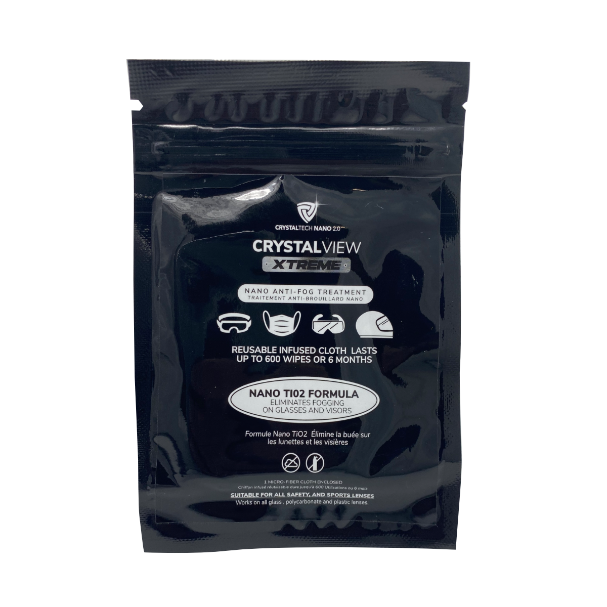 Each CrystalView- Anti Fog sachet includes a nano-based TiO2-infused cloth wipe which is ready to use. Simply wipe the cloth both sides of your lenses after you’ve cleaned them and put the wipe back in its sealable bag. Each wipe will offer anti fog protection for up to 6 months!