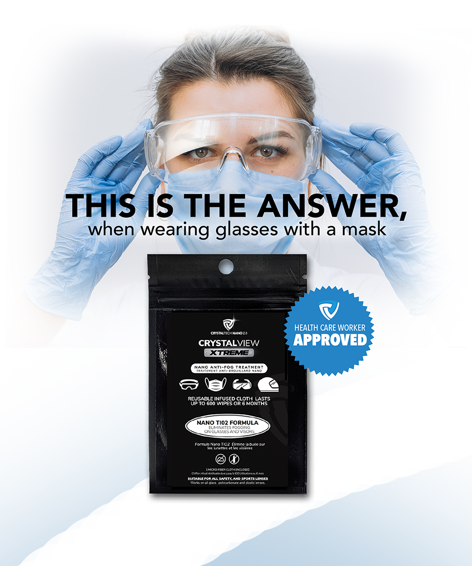 At Nanotech Surface Solutions we are totally aware that in order to stop the spread of germs and do our part in reducing the number of COVID-19 cases, we must wear face masks and practice social distancing. We are also aware that wearing face masks is much more difficult for people who use glasses on a daily basis as these will inevitably fog due to breathing, humidity, and temperature changes. This is exactly why we've we’ve introduced CrystalView- Anti Fog to our product line. CrystalView- Anti Fog uses nano-based TiO2 particles to create an invisible protective shield on lenses which prevent fogging for a whole day!