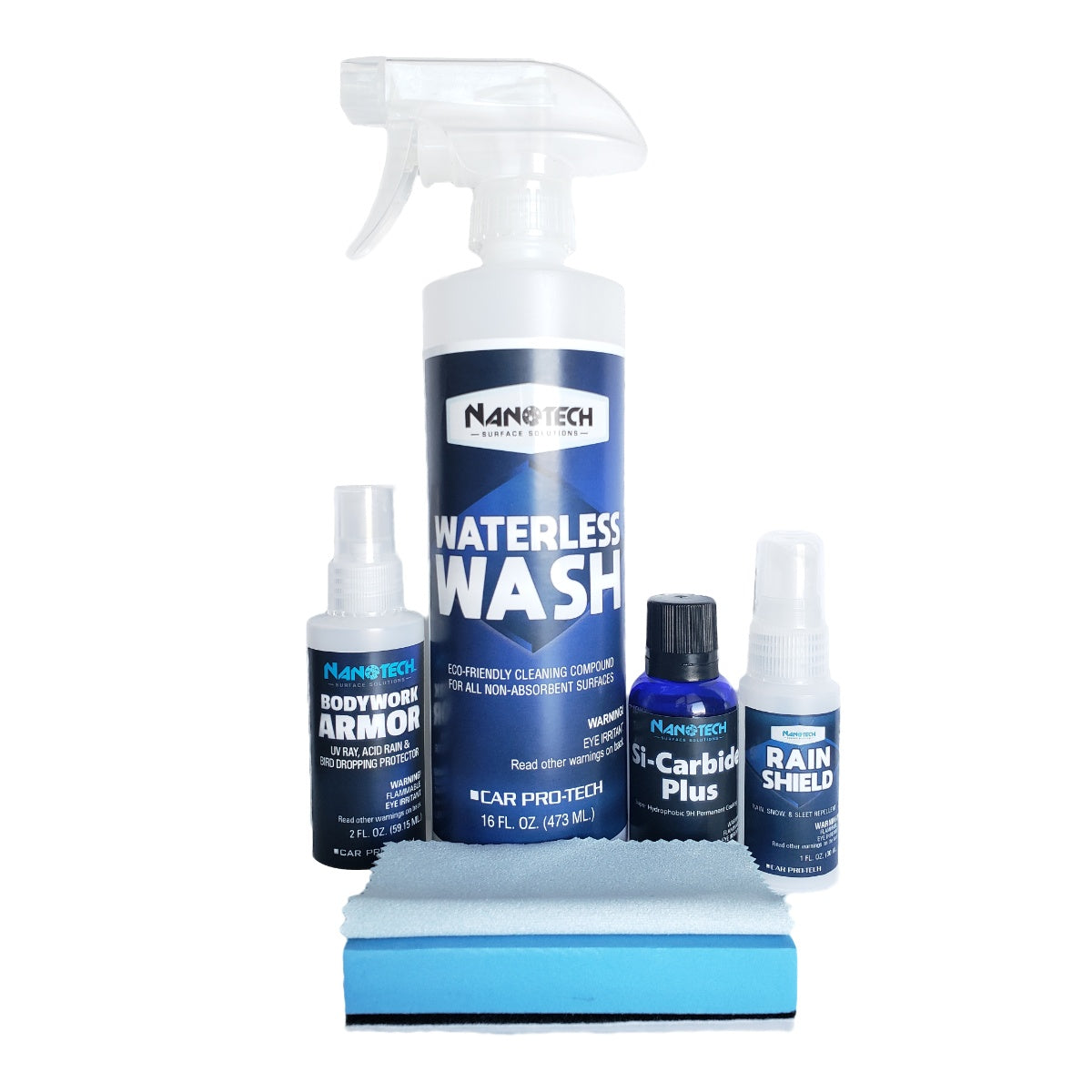 With Ceramic Car Kit, you'll be able to increase your car paint's gloss, and enjoy easy-to-clean properties due to the super-hydrophobic effect created by our permanent ceramic coating system: Si-Carbide Plus, while it also protects it from minor dents and scratches. You will also not need to worry about cleaning your car in freezing temperatures as you'll be able to use our Waterless Wash in order to achieve that nice glossy finish you love while helping the environment by saving a ton of gallons of water. Last but not least, our windshield rain repellent: Rain Shield will help increase visibility by making it easier to remove sleet and repelling rain drops from your windshield and windows making it safer for you to drive in this weather.